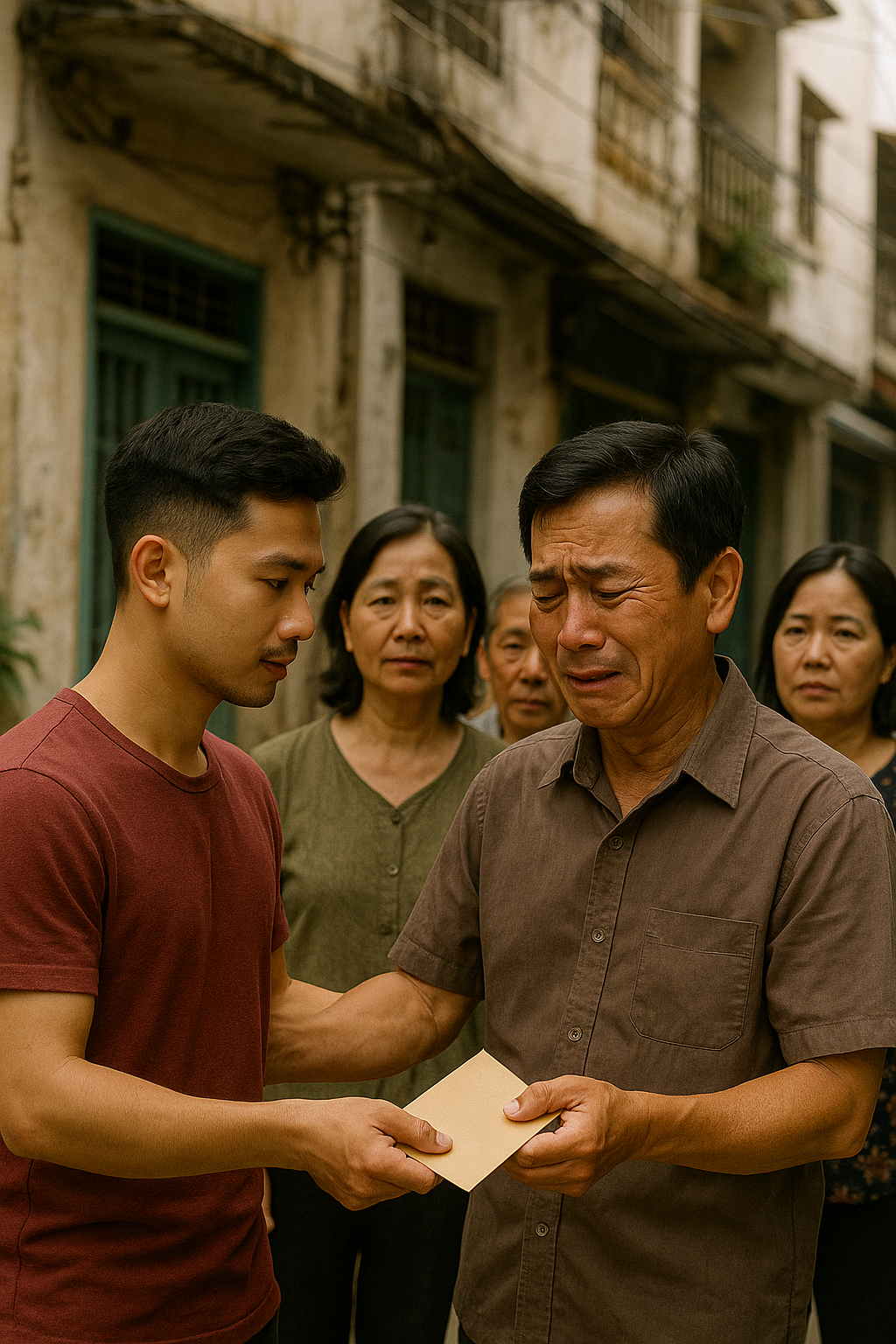 Một chiều đông, khi không khí lạnh giá bao trùm, cửa nhà tôi bỗng vang lên tiếng gõ khẽ. Người thanh niên đứng trước mặt tôi tự giới thiệu là con trai của người hàng xóm năm xưa. Anh run rẩy, tay cầm một phong bì đưa cho bố tôi, nói với giọng xúc động:
