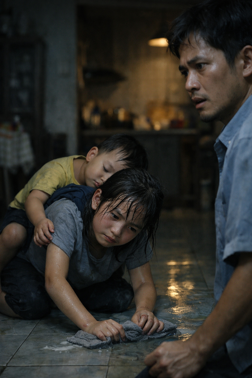 Con bé cầm giẻ lau sàn, tay run lên từng nhịp. Mỗi lần lau, cả người nó nghiêng đi vì sức nặng phía sau.