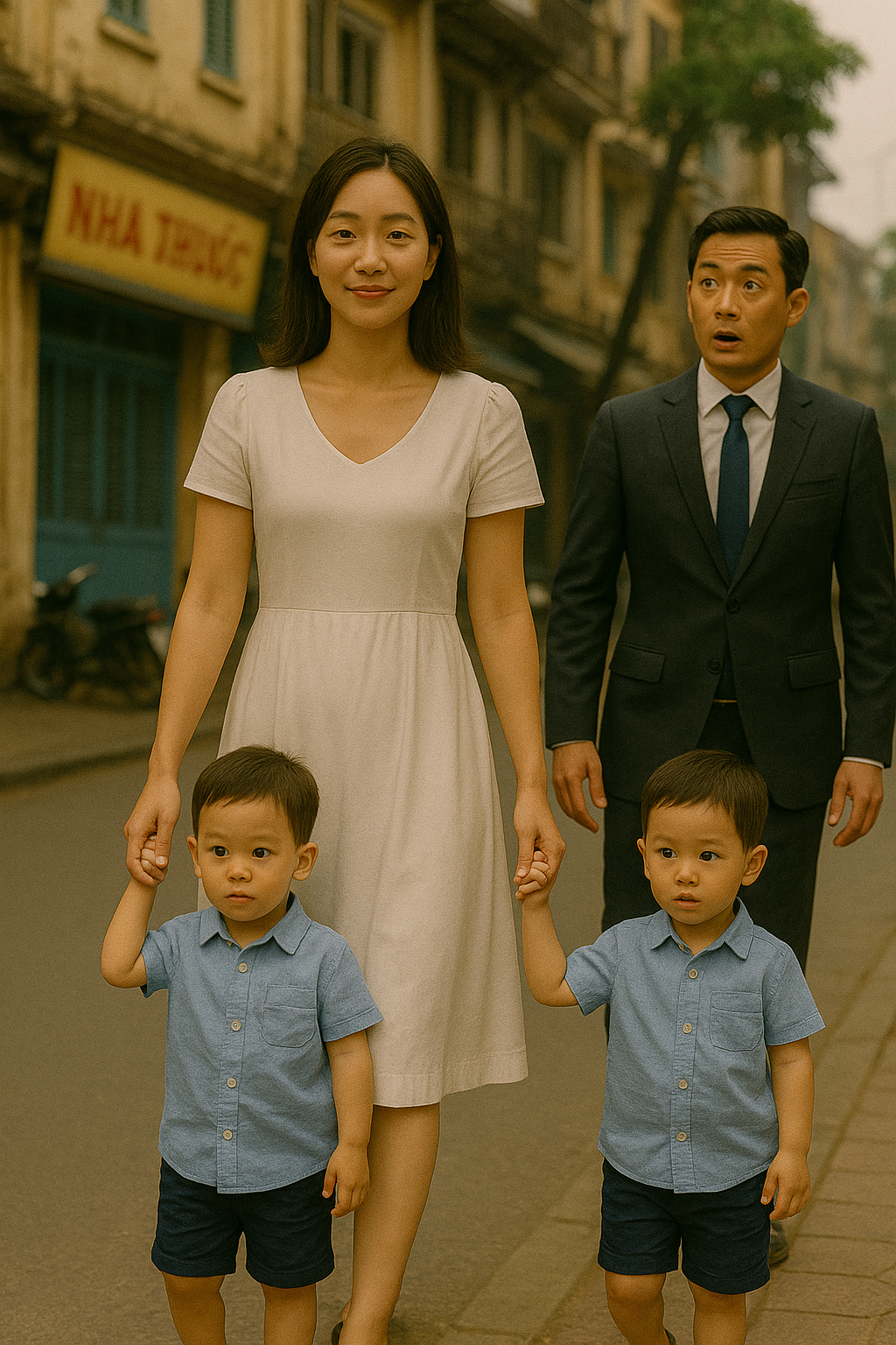 Bên cạnh cô là hai bé trai chừng ba tuổi, mặc áo sơ mi xanh giống hệt nhau, tay trong tay lon ton chạy cười vang.